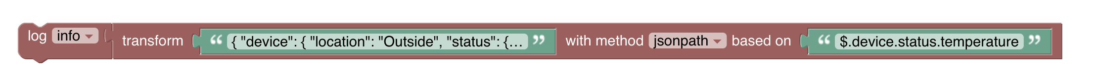 var jsonpath2= Transformation.transform("JSONPATH", "$.device.status.temperature", '{ "device": { "location": "Outside", "status": { "temperature": 23.2 }}}');
