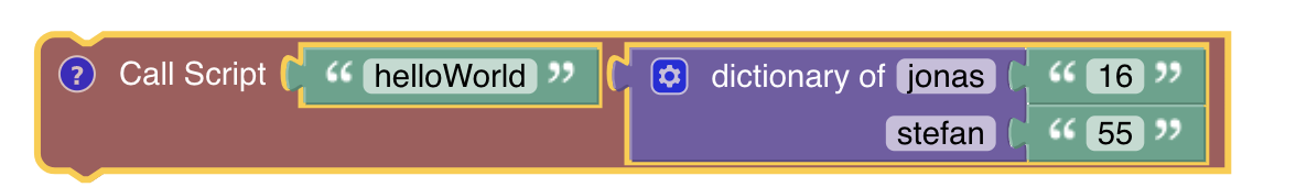 Hereâs a correct (I hope, not tested at all) implementation of the oh_callscript block, hope it answers your questions: