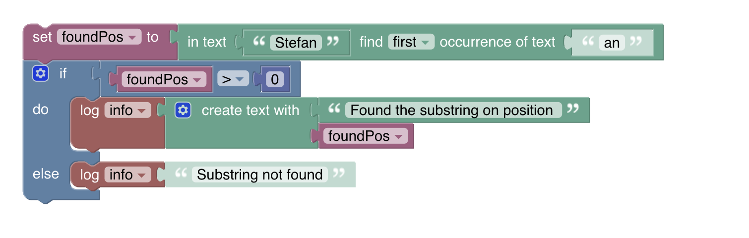 if(mySring.contains("Foo")){. So themyString.containswould be a block that returns a boolean which can be plugged into a condition under Logic.