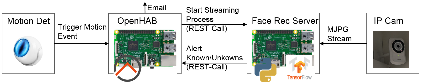 Build your own face recognition server that interacts with openHAB by using motion detectors, IP cameras and a small DIY python application on a RPi3.
