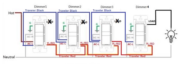 I installed four FEIT Dimmer switches on one circuit in my hallway. Currently my hallway lights turn on and off but only from the Dimmer Switches located in Boxes 3 and 4. The tiny green LED lights and little white circle turn on and off on Dimmers in Boxes 1 and 2 (independently of the other switches) but do not control the lights.