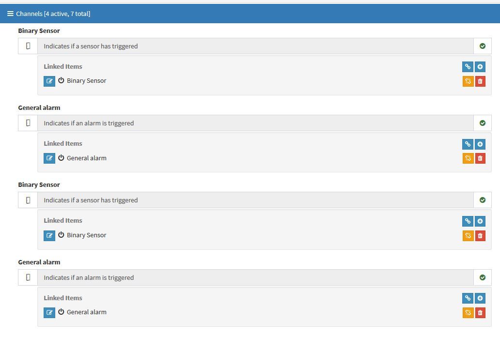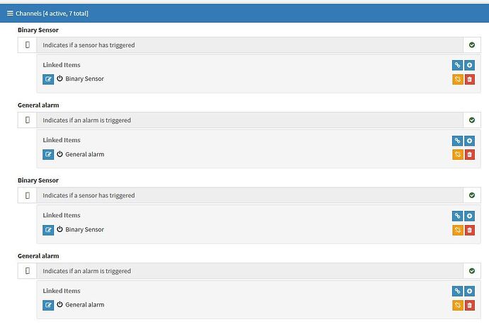 Strange - the binding says it is sending the state to ON / OFF for these channels . HABmin seems to think the channels are linked to items - are you sure the items are switches (sorry - I’m sure you are, but just double checking as everything seems to be working with these channels - except for the ‘small’ point that they don’t seem to actually work!)