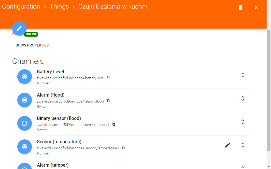 I have a problem with Fibaro FGFS-101 flood sensor. So far I was able to get working with OpenHAB 2.3.0-1 all its features except for tamper alarm. When tilting/shaking the device it beeps, but thing’s item is not notified on this event. Here is my item definition: