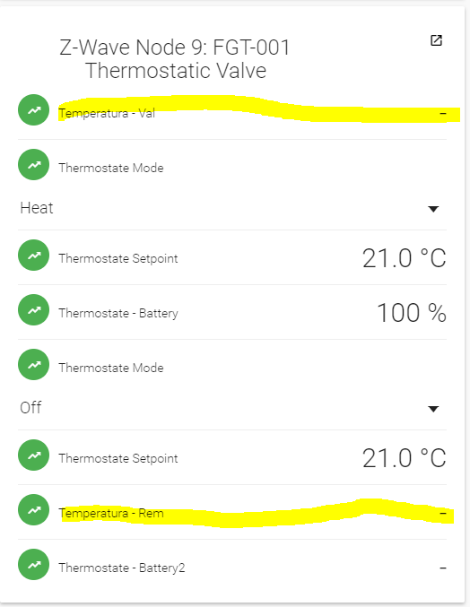 I am using the Fibaro Heat Controller FGT-001 + FGBRS-001 (thermostat radiator + Temp. Sensor) and after Install and configure the device in the Openhab using Z-wave network. I can do a control of operation mode (OFF-Heat only), push the setpoint to valvule and see the Battery level of valvule, but I cannot see the temperature of valvule and the aditional temperature sensor.