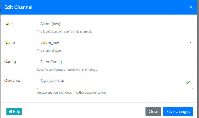 The item attached to the Battery-level channel updates properly, but I am not getting data in the other items. Each hour, I see a log entry for the detector’s heartbeat with a message: channel alarm_system is not implemented. I’m not sure how to handle this.