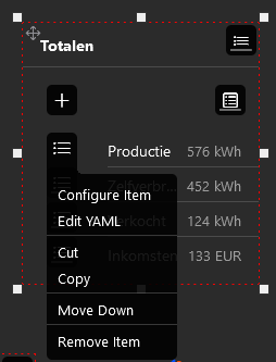 - The totals are a Label List Card. But there is a catch: the menus of the oh-label-items (picture below) don’t work. You must edit the YAML of the oh-list-card (top right button)