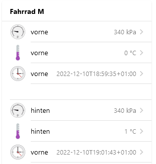 - tire pressure sensors for Schrader/American valves (e.g. https://de.aliexpress.com/item/1005003819238629.html (includes a display unit - not required, but handy for identifying sensor ids)