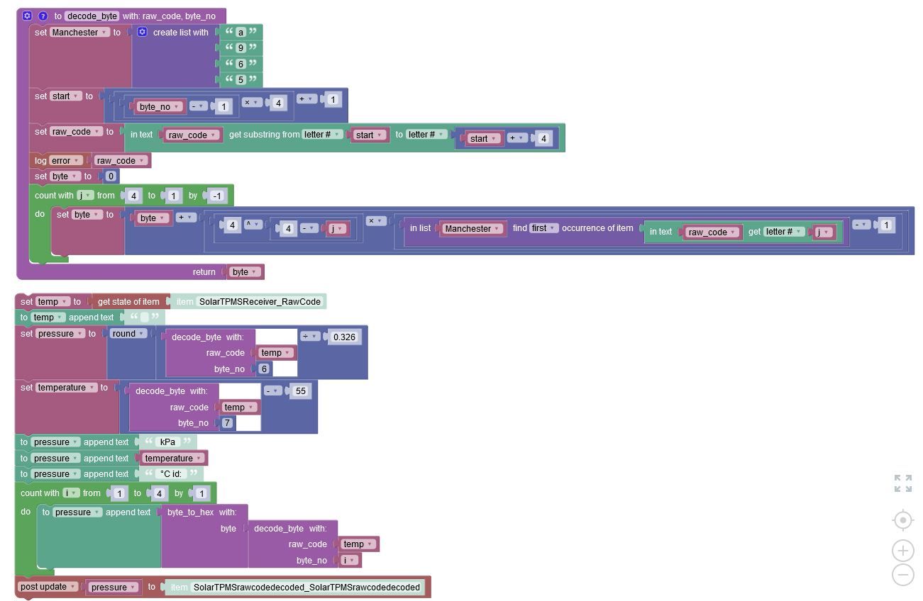 As mentioned above, the custom decoder (rtl_433 -X option) provides the raw bit patterns. Lets decode the raw data using Blockly: