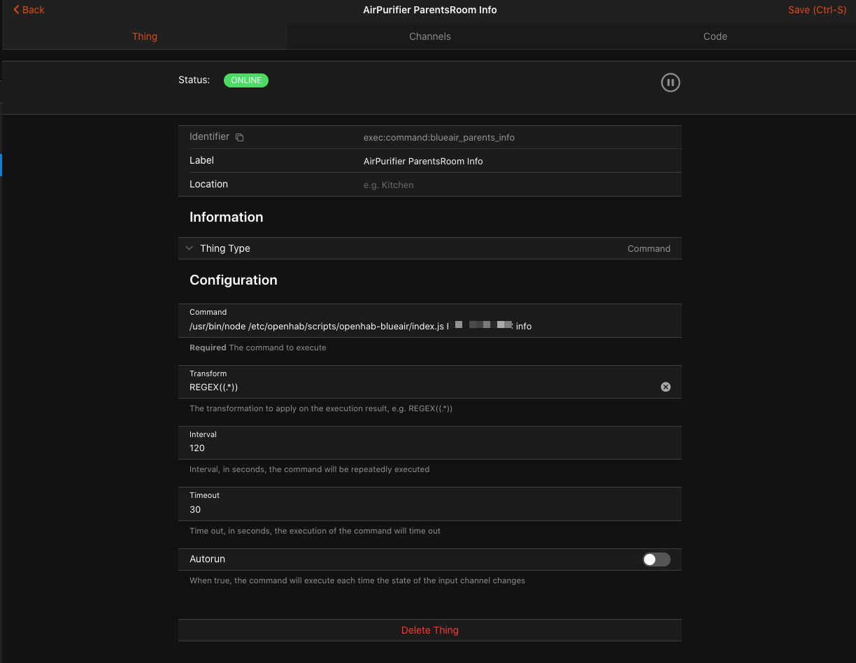 As there isn’t (yet) a Binding for foobot or Blue Air air purifiers, I’ve tweaked some JS code and implemented some Exec Things and related Items / Rules to implement a few features using the REST API.