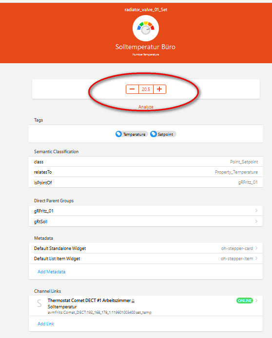 Number:Temperature radiator_valve_01_Set "Solltemperatur Büro[%.1f %unit%]" <heating1> (gRFritz_01,gRtSoll) ["Setpoint","Temperature"] { channel="avmfritz:Comet_DECT:192_168_178_1:119601003400:set_temp",listWidget="oh-stepper-item" [step=0.5, min=6, max=24], widget="oh-stepper-card" [step=0.5, min=6, max=24]}