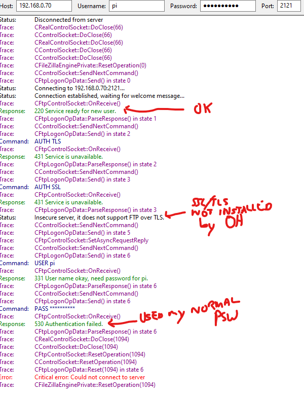 Basically I’m trying to implement the example in the ftpupload documentation for a camera trigger. After some back and forth with the Reolink camera technical support, it came to light their FTP output does not support TLS, but does support SSL 3.0. I verified this by ticking that box on my windows FTP set-up and the camera was able to connect and send images and video when motion was triggered. However, my OH 2.4 is on the Rpi3 and I have struggled to find the files that the ftpupload binding uses. Below is the log of a typical failed login attempt (many have been tried with different ID’s and passwords).