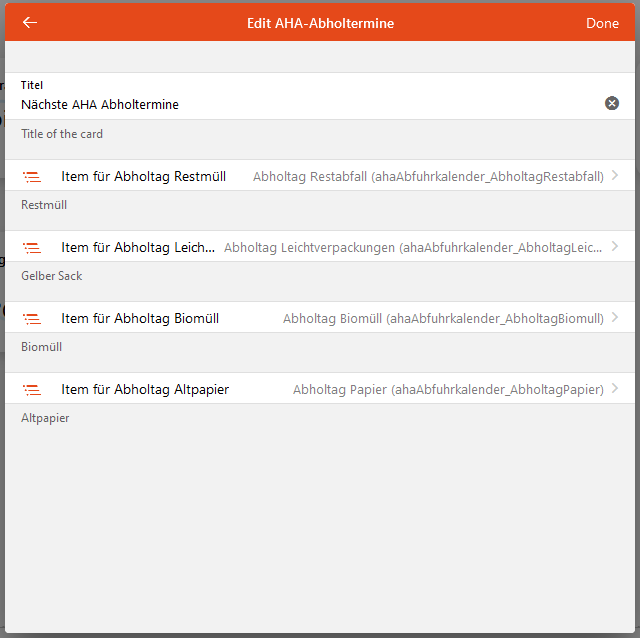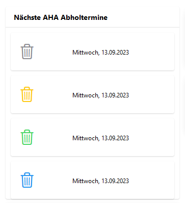This widget is a variety of another garbage collection widget, to use with the aha Müllabfuhr binding for the Hanover Region in Germany or for other garbage collection sevices that can only provide single dates for the four typically collected sorts of Garbage, identified by the typical color of dustbins. Just give the widget a name and the date items for the different sorts of garbage.