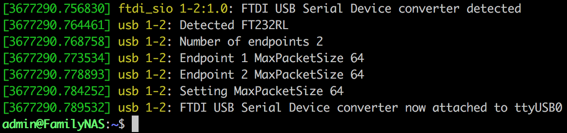 [302774.681429] usb 1-1.3: FTDI USB Serial Device converter now attached to ttyUSB0