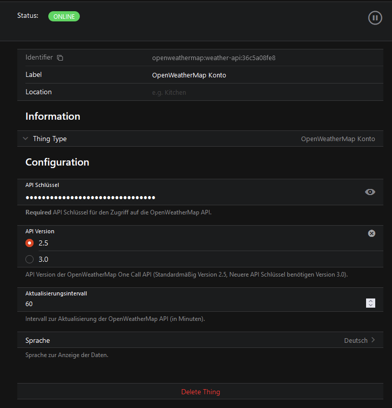 Anyhow… could you please post a screenshot of your a) your OpenWeather bridge/account settings and b) your current OpenWeather condition settings within openHAB as I did in my original post? I just want to try it with your settings…