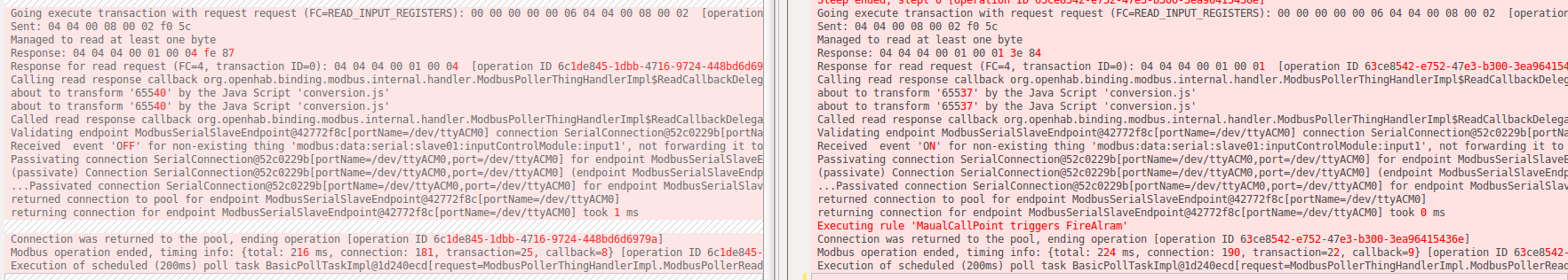 2019-04-09 15:20:51.248 [DEBUG] [rt.modbus.internal.ModbusManagerImpl] - Execution of scheduled (200ms) poll task BasicPollTaskImpl@18fefb30[request=ModbusPollerThingHandlerImpl.ModbusPollerReadRequest@6d91bb9a[slaveId=4,functionCode=READ_INPUT_REGISTERS,start=8,length=2,maxTries=3],endpoint=ModbusSerialSlaveEndpoint@6cebdc44[portName=/dev/ttyACM0],callback=org.openhab.binding.modbus.internal.handler.ModbusPollerThingHandlerImpl$ReadCallbackDelegator@818e012] finished at 1554803451248. Was started at millis: 1554803451028 (=duration of 220 millis)