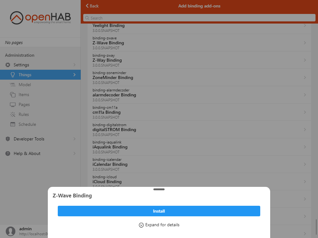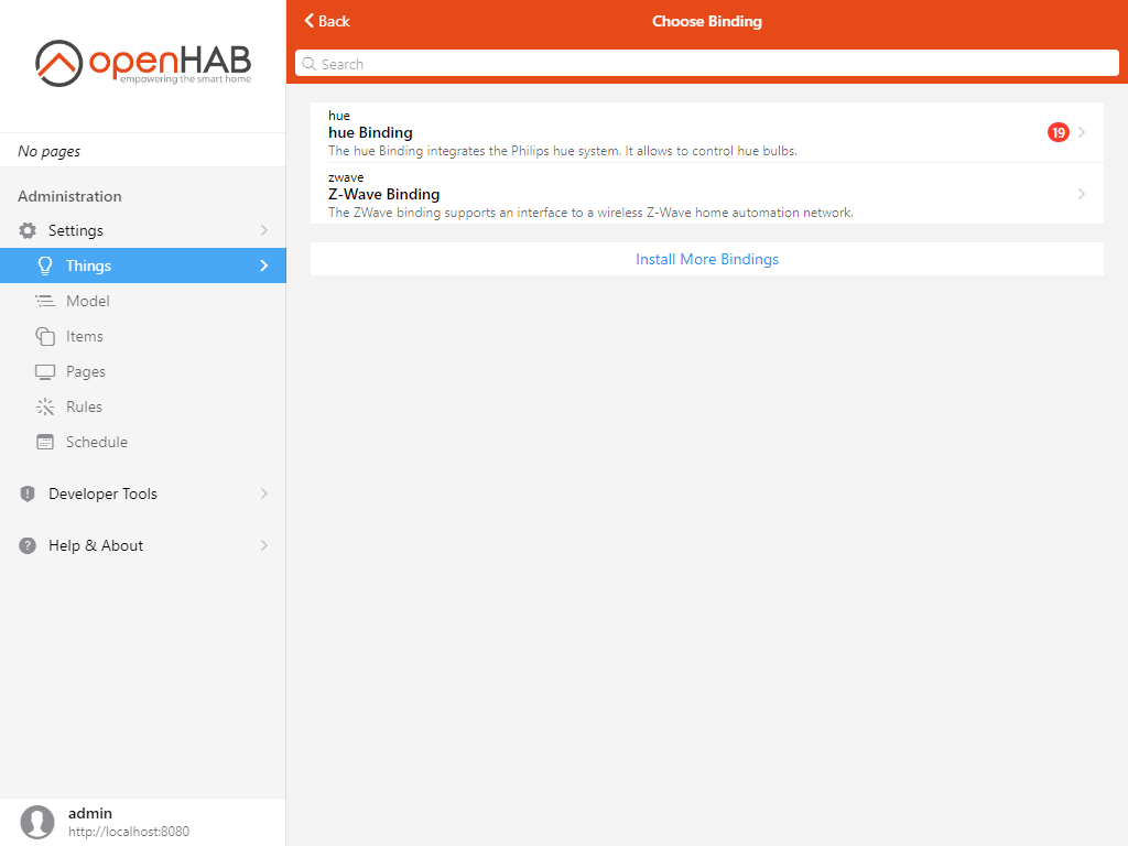 We need to install the Z-Wave binding. Click “Install More Bindings”.