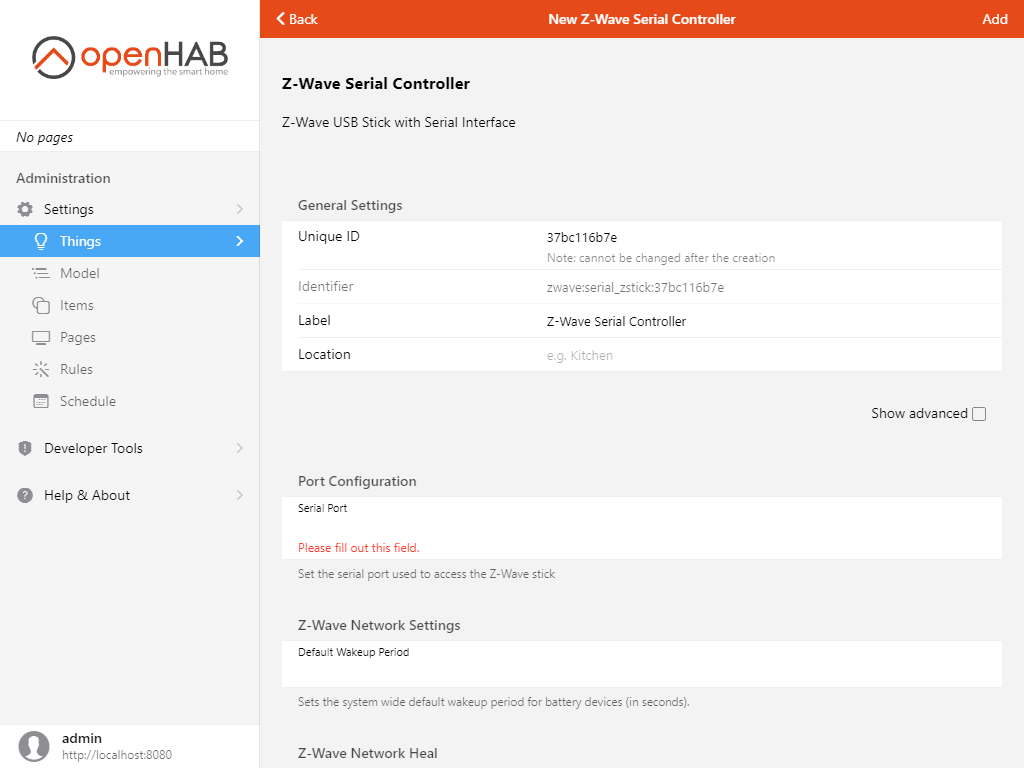 Choose the correct port, alter the name and/or ID of the controller Thing, then click Add in the top-right corner.