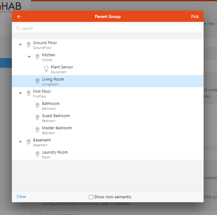 Select Pick From Model in the Parent Group section, the treeview of the Locations and Equipments will appear; select the parent group, for instance Living Room, then choose Pick in the top-right corner of the dialog box.