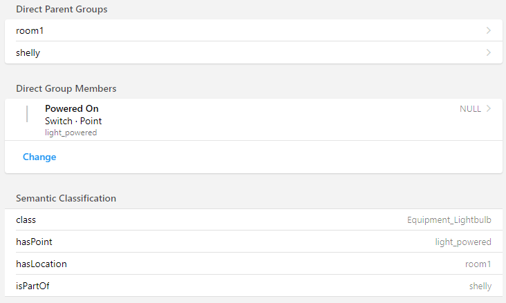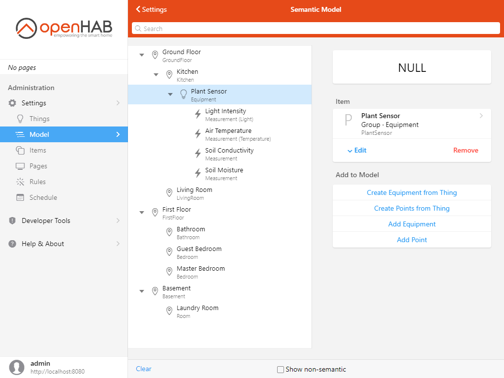 There may be times where a user needs to add existing Items to their model. Perhaps they are migrating from an older version of OH, they did not follow the advice above to start with the model to begin with, or they are following a tutorial or example that doesn’t include the model. In this case all is not lost. Existing Items can be added to the model. Browse to the Item in the Items settings, click on Edit and choose an appropriate Semantic Class and Semantic Property. Then add the Point as a member of the appropriate Equipment or Location Group. If the Equipment Group doesn’t exist yet, create a Group and use the appropriate Equipment semantic tag first and add the Equipment to the appropriate Location Group.