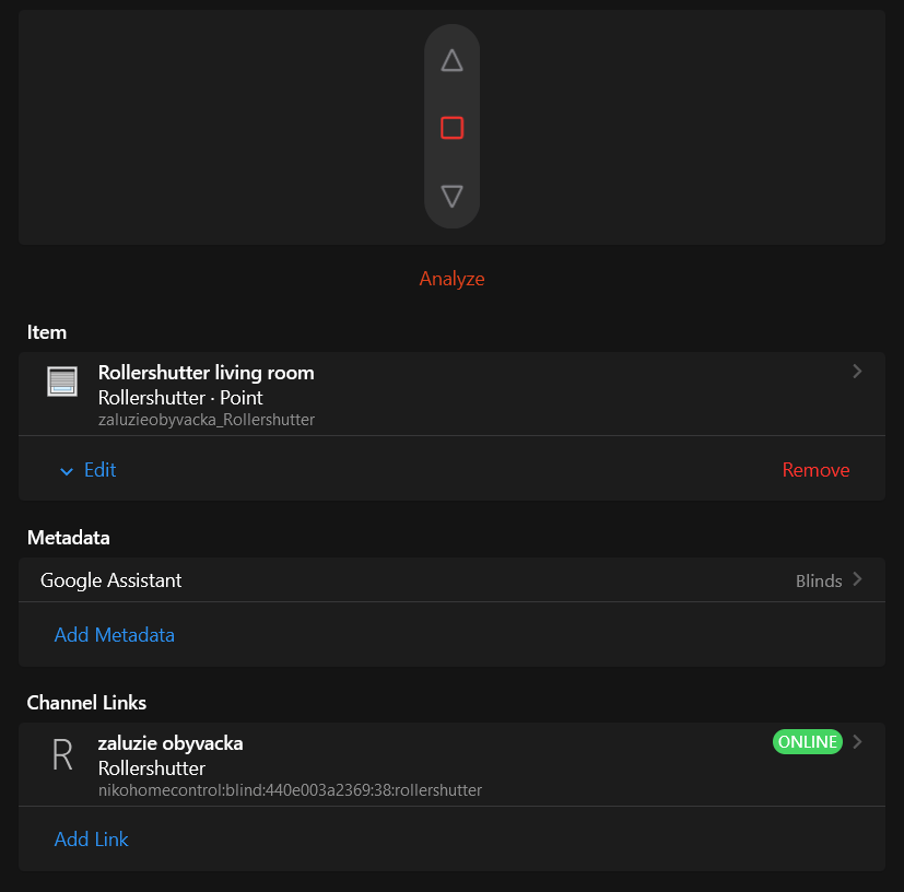 It is all done using OH Cloud connector to GA service. I am using Niko Home control binding for controling the items.