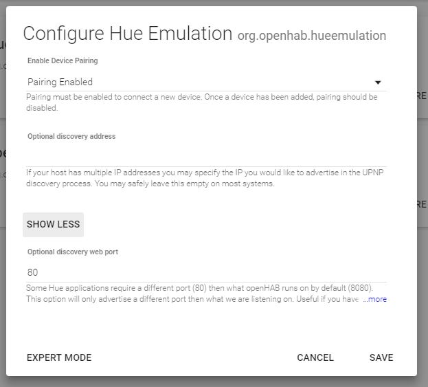 There is one caveat, though: Google Home does not listen to the port it is told, but always expects the hue bridge to be available on port 80 - this means that you have to configure openHAB to use port 80 instead of 8080 for the webserver (check the docs on how to do that) and for using port 80, you need to make sure to run it as root.
