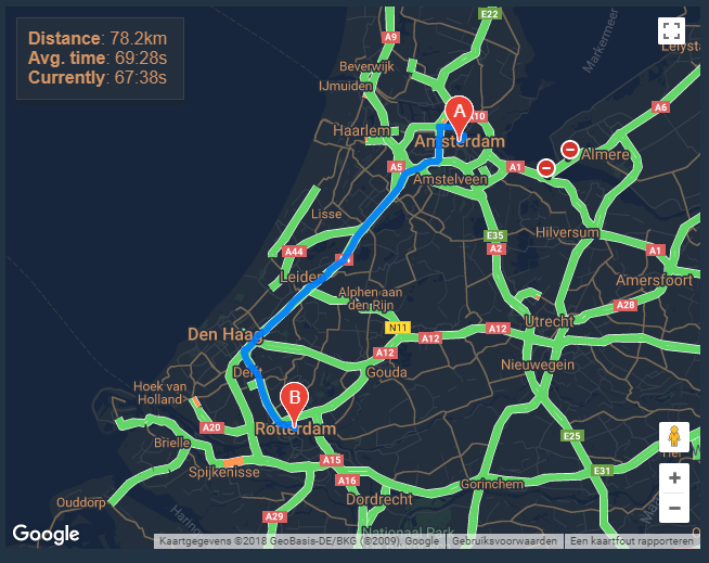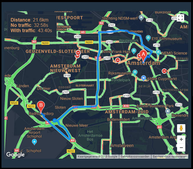 NEW 2018-02-27: Added distance and travel time calculation between two locations. It calculates the avarage travel time, and with current traffic conditions. Import the new widget and get the new ‘maps.html’ file.