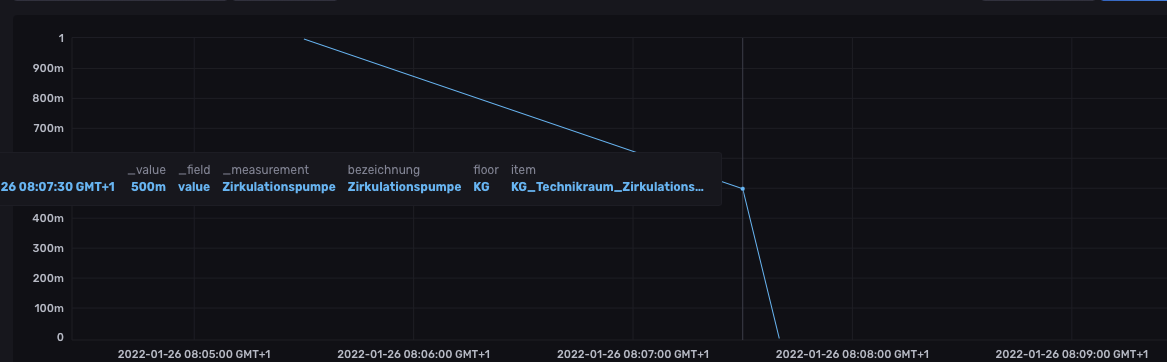 I used to plot many switches in Grafana as a heatmap. It worked very well without doing anything special. I haven’t been able to recently, but only because the binding was changed so that the switch channel is now a string type and that doesn’t work in influx-Grafana.