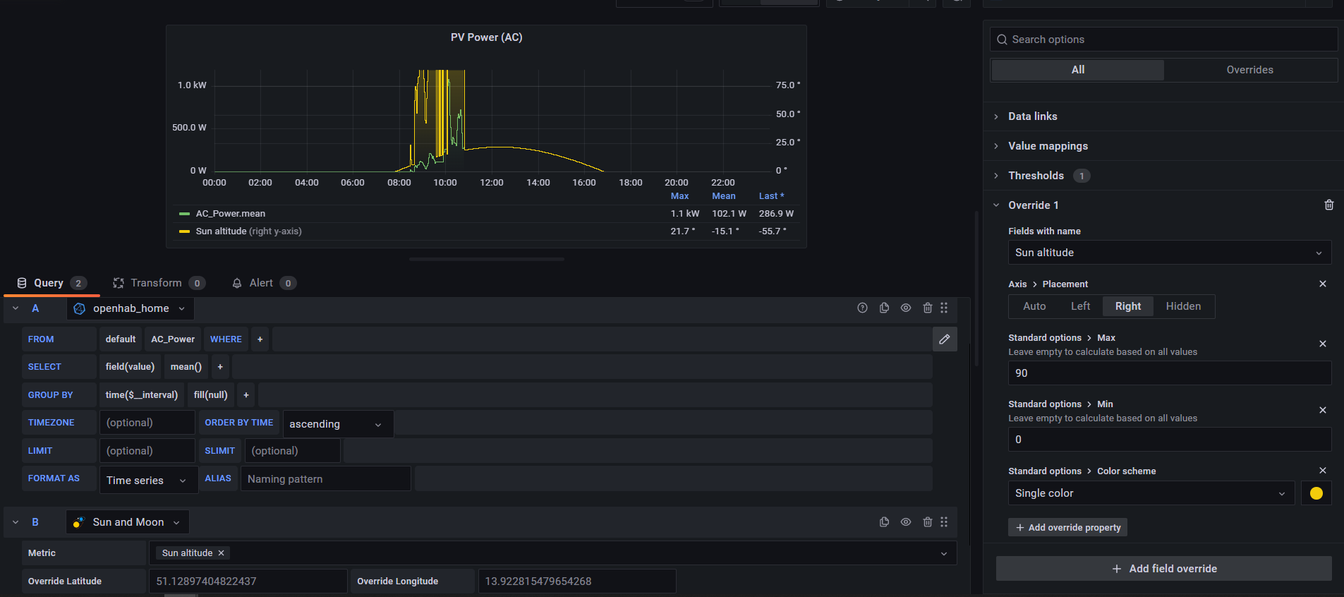 i want to create a chart with two axis (Power and sun altitude). This chart is so popopular, but I am despairing. I create the chart (time series), choose “Mixed” Data source, add query 1 (Power) → left axis, added secound query (sun altitude with the sun and moon plugin) and shift them to the right axis and override “sun altitude”