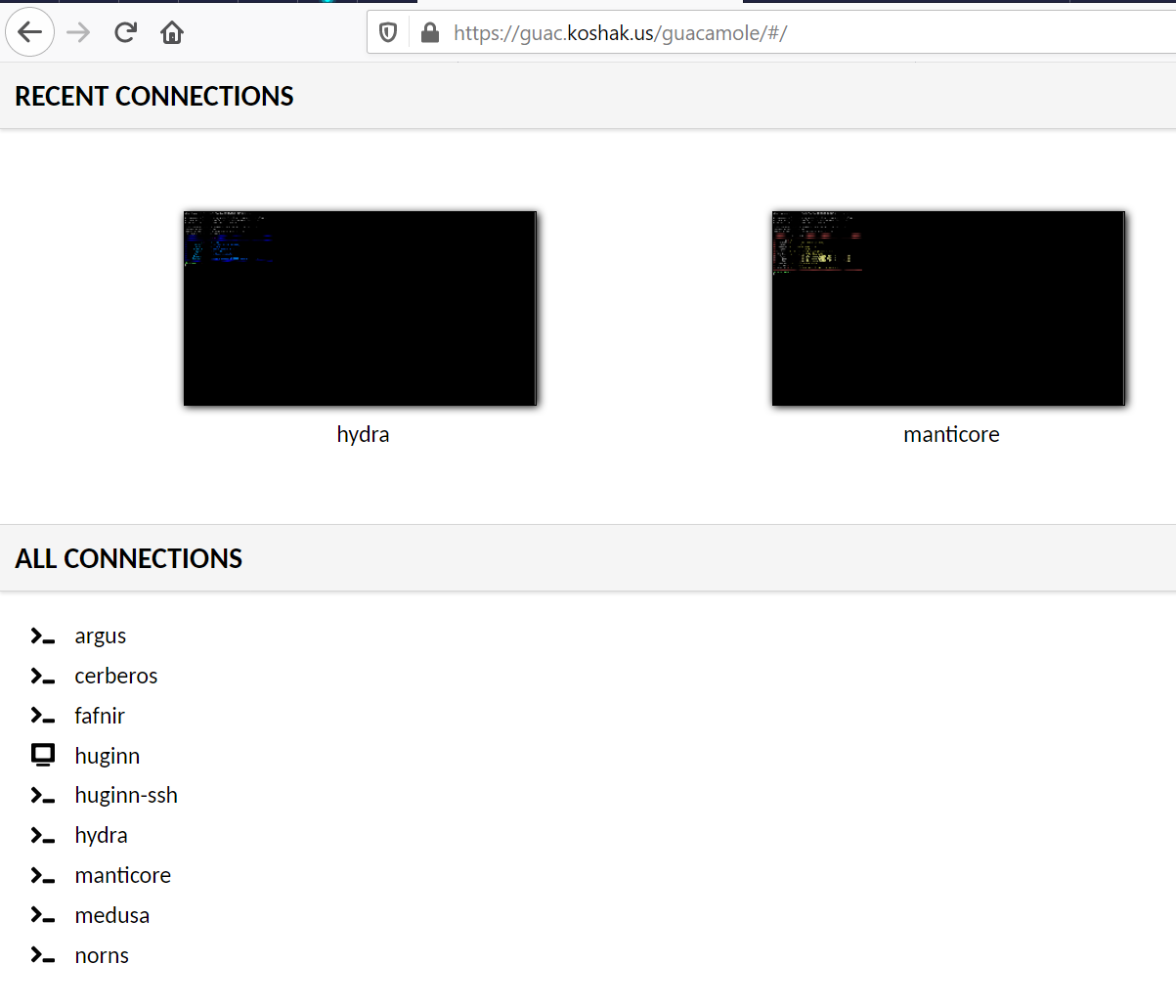Configuration is pretty easy but there are a lot of options so I suggest reading the Guacamole docs. I have one VM running a desktop version of Ubuntu with VNC configured and the rest of my VMs and RPis are headless with only terminal access. I configured a connection for each.