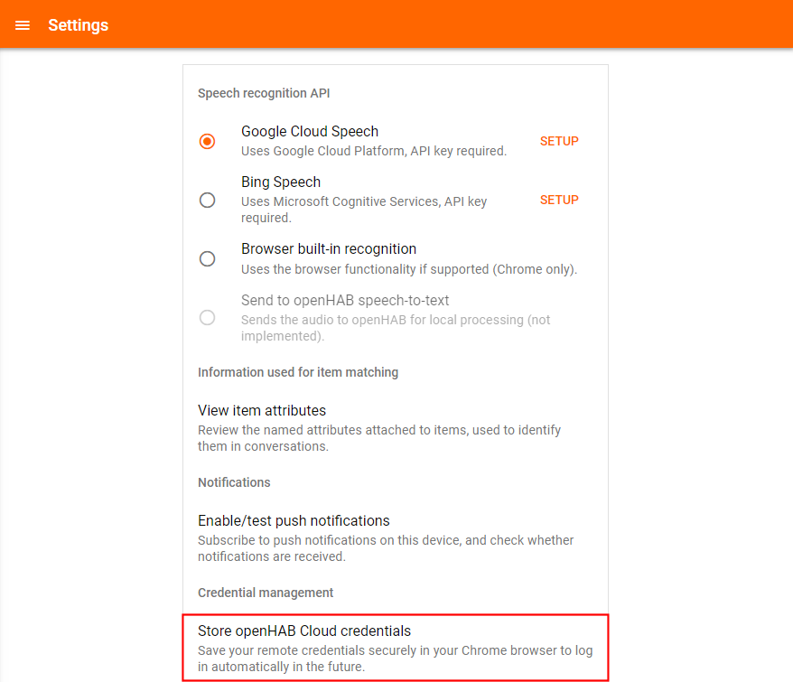 If you’re using Chrome, HABot can leverage the Web Credentials API to avoid having to log in to openHAB Cloud/myopenhab.org: go to the Settings screen from the side bar, and provide your credentials in the dialog box. The browser will ask you if you want to save them in a separate dialog, which you’ll have to confirm - they will be stored locally and securely.