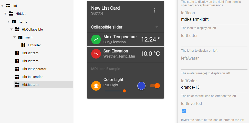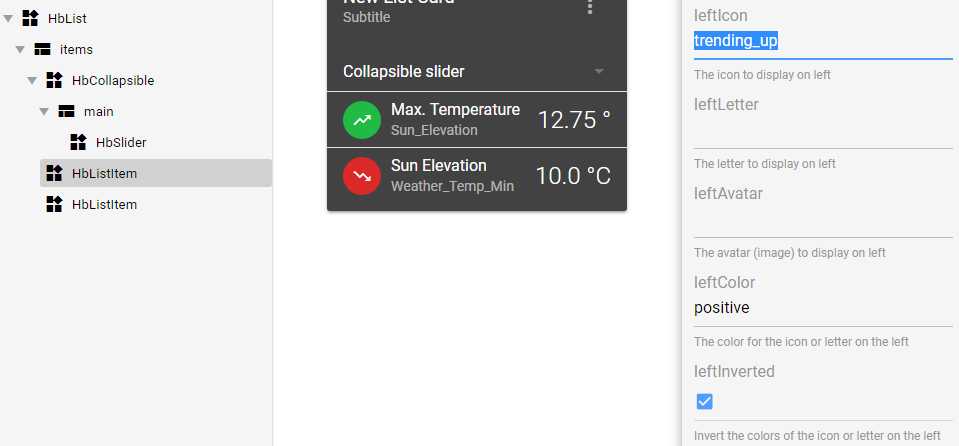 As presented in the previous article, HABot’s card are trees of components and slots. Most components are nearly straightforward hosts for their counterparts from the Quasar Framework - HbBtn is a wrapping around Quasar’s QBtn, HbKnob is a wrapping around QKnob, and so on. They will often have configuration properties mimicking the original Quasar component’s.