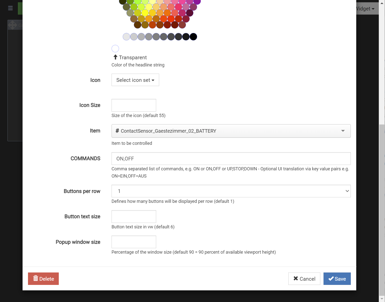 Once you add the custom widget to a dashboard and then edit the settings, the default values are gone. (values 6 and 90 are empty). Interestingly the default vaule for COMMANDS is still ON,OFF
