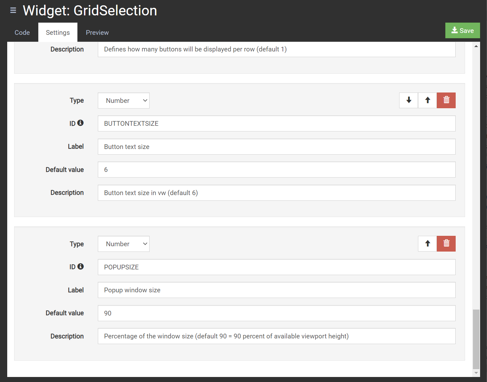 Import the attached custom widget. If you open the code editor and settings window you can see the default values being correct. (here BUTTONTEXTSIZE 6 and POPUPSIZE 90)