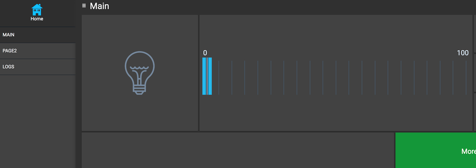 I’ve created a panel consisting of three screens, with buttons controlling movement between them. On the first panel is a Slider for controlling a dimmable light: