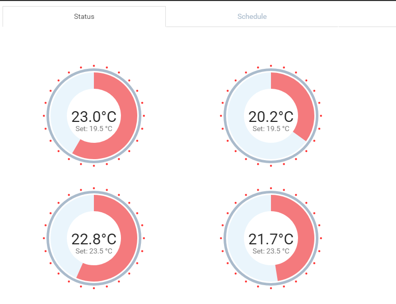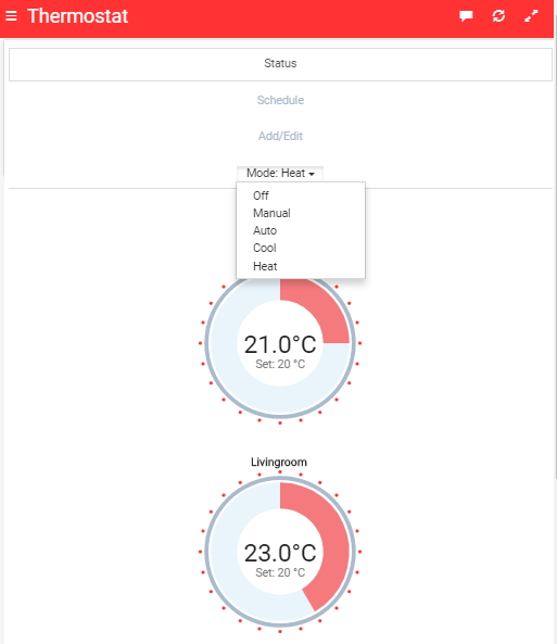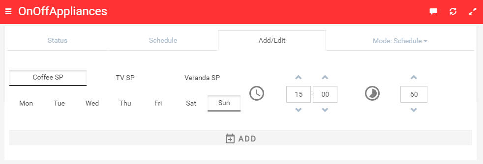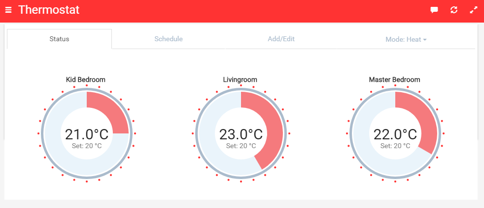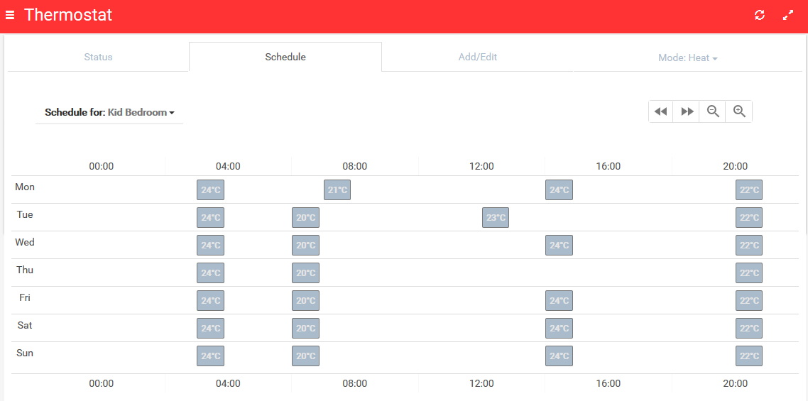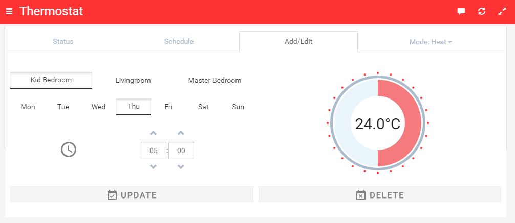 [Fixed in Beta v0.2] Widget refresh if the value changes for any of the used items (e.g. room temperature change).[Fixed in Beta v0.2] A nice theme/page arrangement.[Fixed in Beta v0.2] Use “controller as” in widget and JavaScript code.[Fixed in Beta v0.3] Schedule view: responsive design and display all events if there are more than one scheduled for the same hour (currently it will display only the last for each item).- Add/Edit view: items list responsive design.