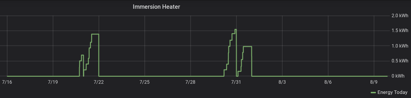 At the moment, the boiler is off - I don’t want to heat a whole tank of water at the start of the day if the solar panels would have done the job later for free. I’m monitoring the power consumption of the immersion heater, and it looks like the solar panels are doing the job on their own at the moment (little to no energy used by the immersion heater).