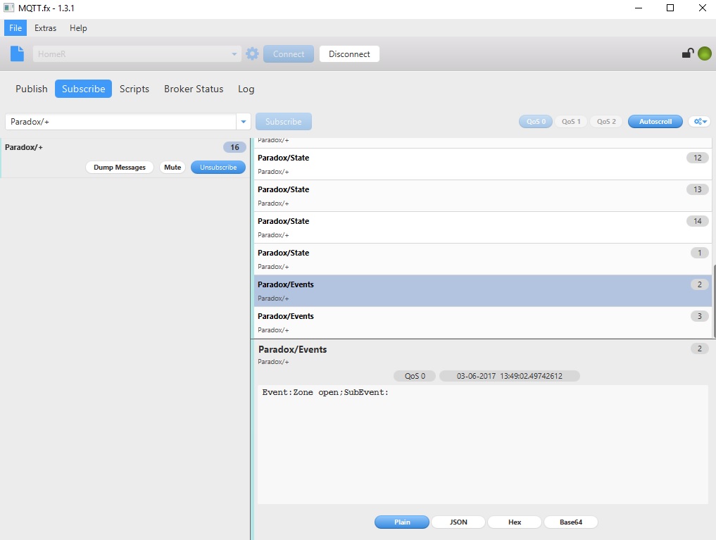 2017-06-03 20:22:35.719 [TRACE] [t.mqtt.internal.MqttBrokerConnection] - Received message on topic 'Paradox/AS/P1' : Disarmed