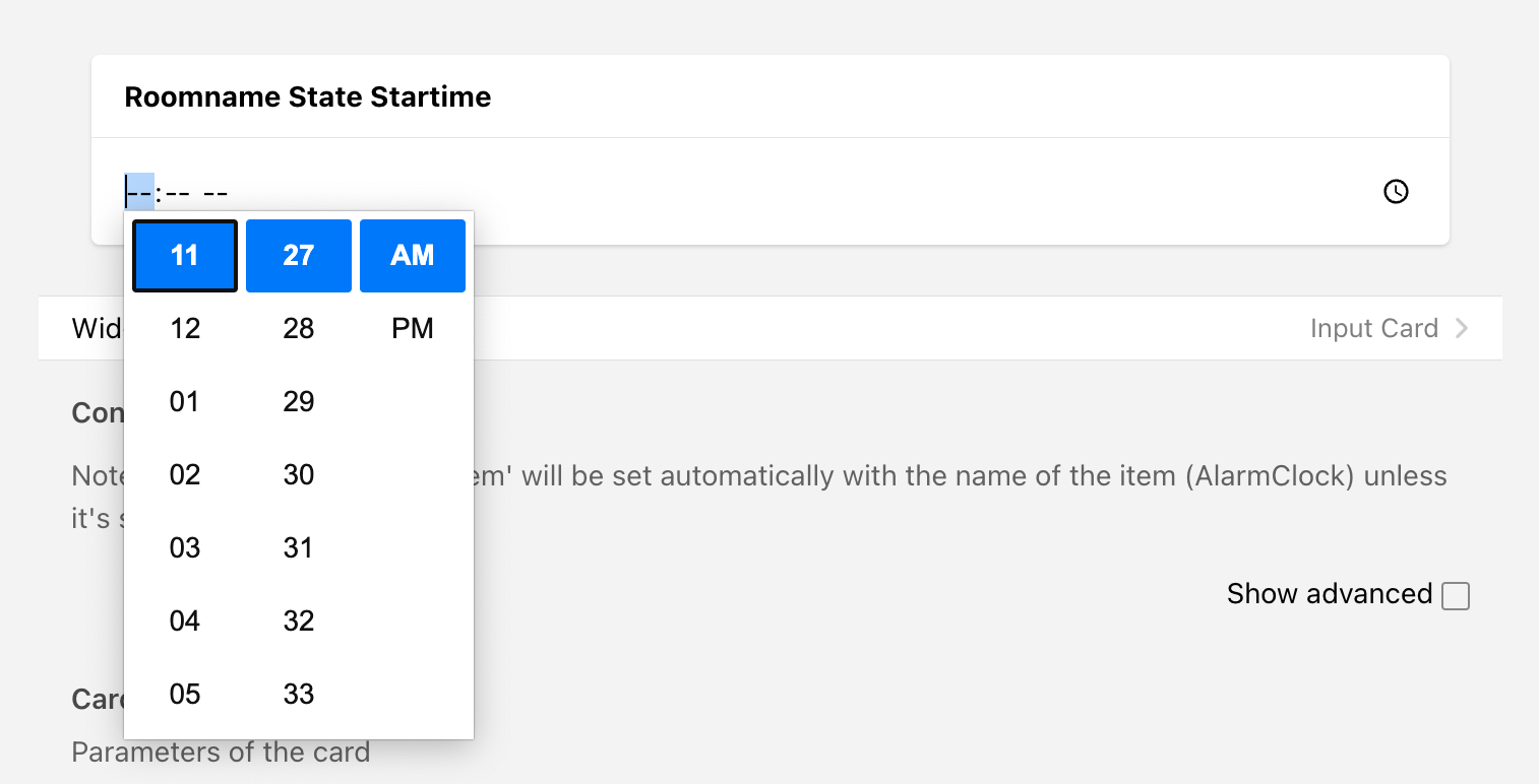 - Use an input card with the “type” set to “time” This generates a widget that looks like this.
