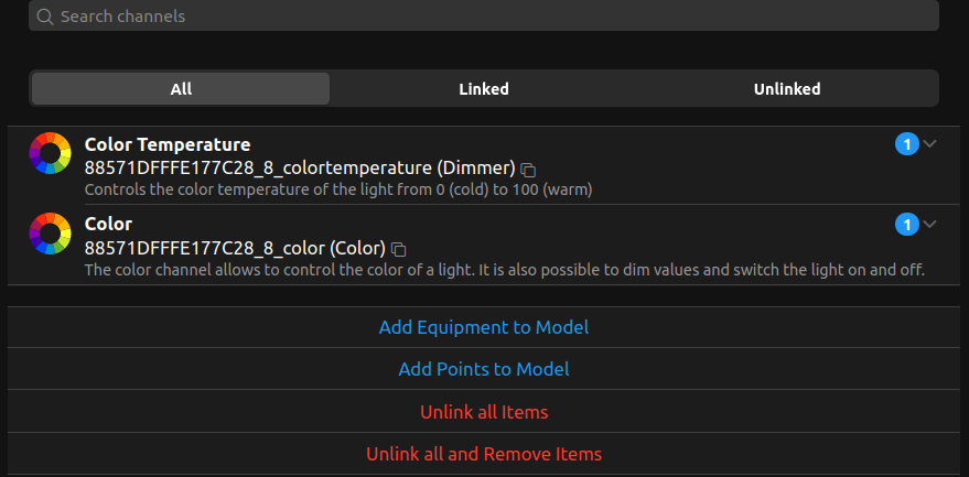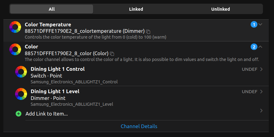 As seen in this picture, the two items control on/off and light level. The color temperature channel controls the color temp from 3000k to 5000k via a dimmer item. These lights dont have RGB in them, so these are all the controls I need.