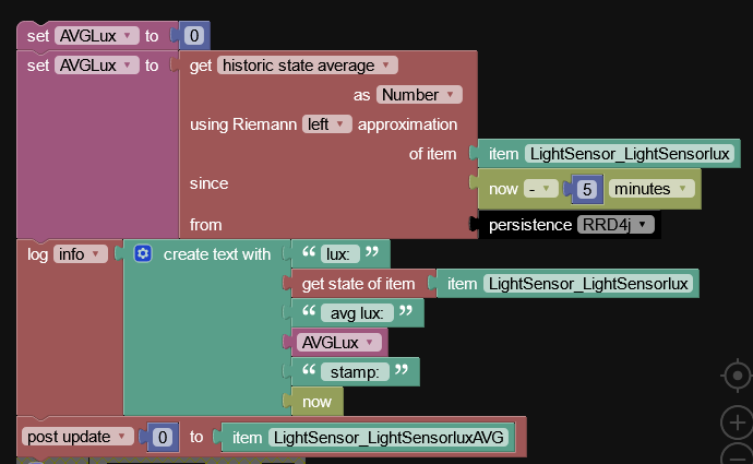 I have a simple rule which after update light sensor lux is updating average item in this thing as following:
