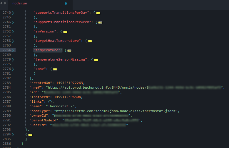 One of the important things to note in this JSON data is that there are a number of ‘nodes’. Each node seems to be for various internal ‘devices’ that your Hive is seeing. In my case, I am seeing 7 nodes in my data. You will have to figure out which of the nodes is for your heating (and which is for hot water, if you control your water from your hive as well). As an aside, there is a node for the water leaking sensor if you have this. However, my scripts do not currently support this.