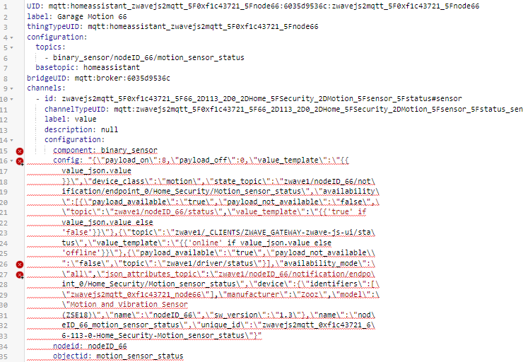 I have been testing some HA configs from Zwave-js-ui. They work fine with one exception, they are displayed on the UI code tab with errors. The impact is that changes (like removing a config) can’t be done. I had to delete the thing and rescan to pick up the changes. My guess is that the config is split-up to fit a certain field size on the UI code tab and that causes the errors.