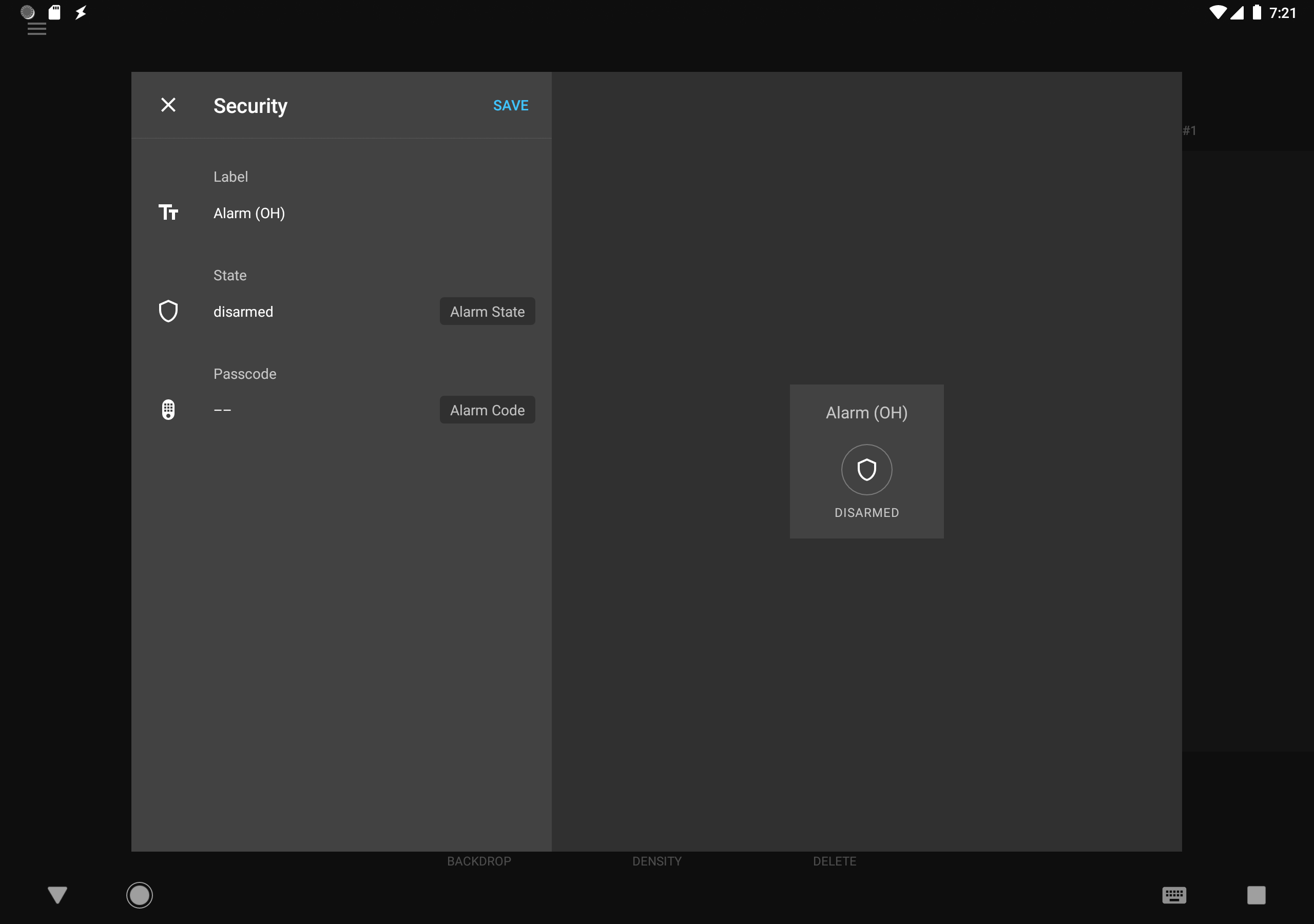 For OpenHAB integration, the widget allows a custom setup with separate alarm state switch and alarm code item. Entered PIN code will be send at the same time with alarm state command.