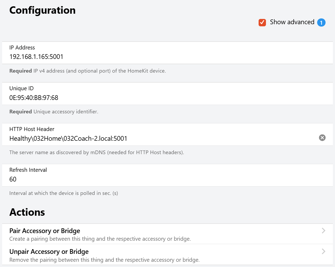 Many accessories expect to receive the exact same Host: header string in the bindingâs HTTP requests as they themselves have previously published in their own mDNS advertisement. But it seems that OH and other mDNS apps are applying extra sequence numbers (in various formats) to disambiguate duplicates. These extra sequence numbers risk to make duplicate devices not work. But you are lucky that your devices apparently do not enforce that rule. However I need to dig into this further to figure out a universal solution.