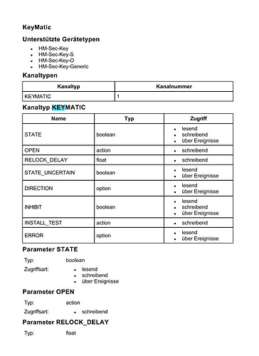 What about opening the doors? There is such a posibility and iths working with keymatic using CCU2 webpanel or @Home ios app. Which datapoint is responsible for this functionality ? I would like to use it in OH.