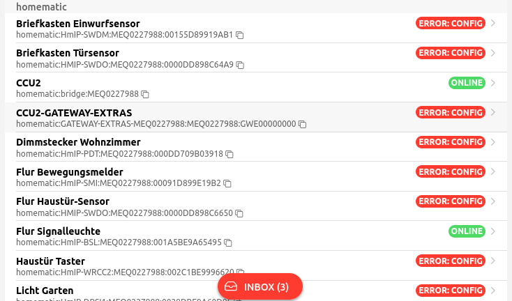 After restarting openHAB, the Things (Homematic devices), which could only be created by setting the ‘Install Mode Duration’ parameter high, show the error “CONFIG: ERROR” (Device with address ‘ABC’ not found on gateway ‘xyz’) and show no reaction in openHAB.