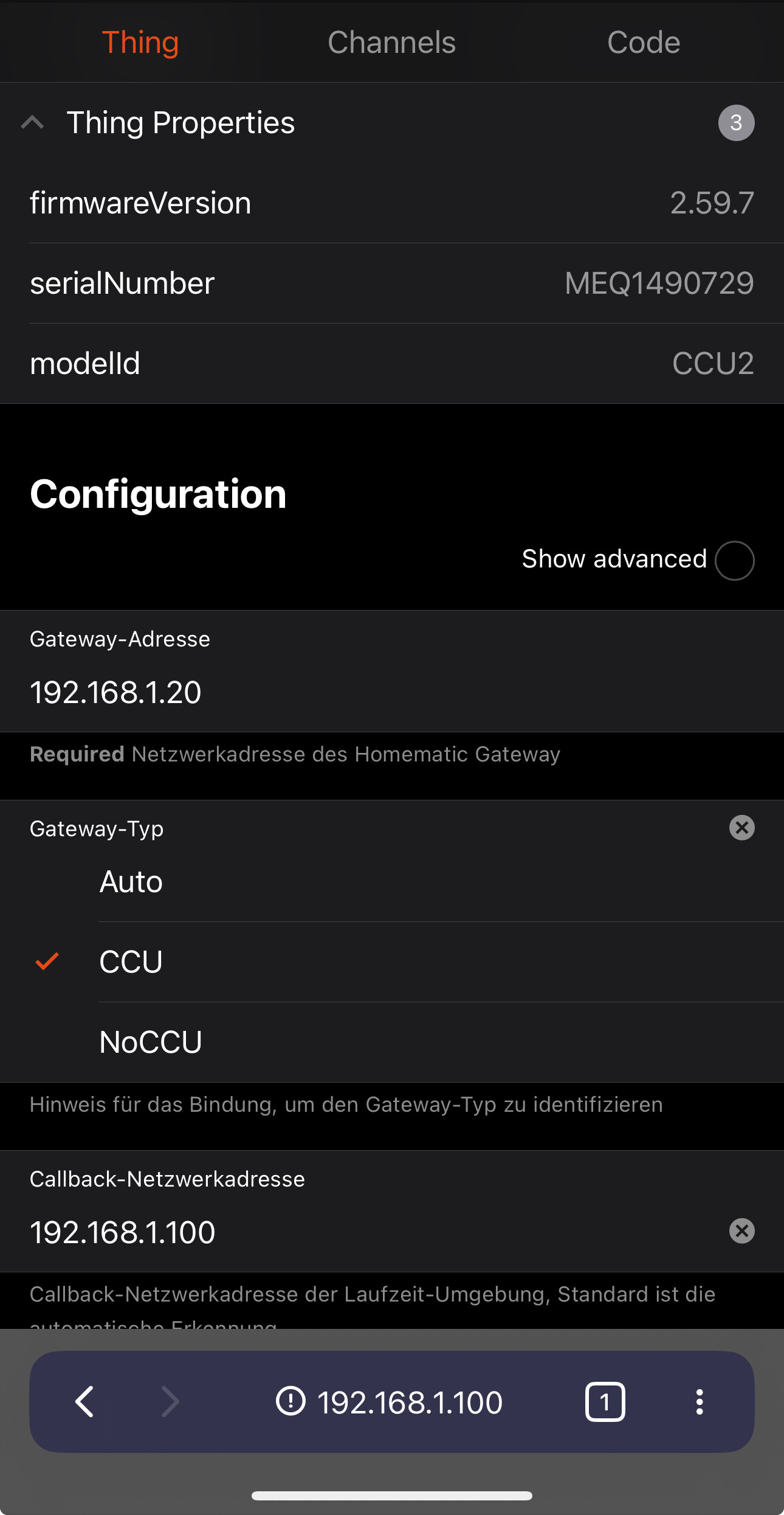 Itās empty. The āGateway-Adressā of the CCU2 Thing is set to the CCU2 address: 192.168.1.20