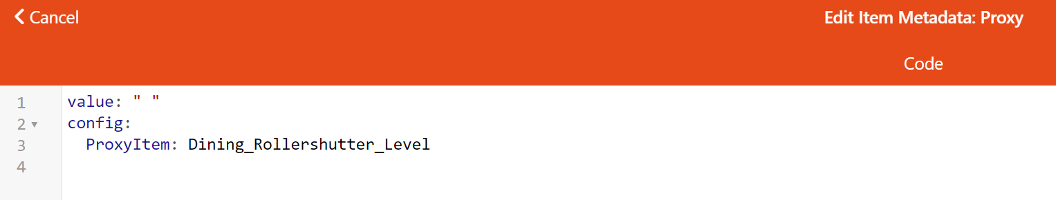 Rollershutter Dining_Rollershutter_Level_Status (HmIpBrollLevel) {channel=“homematic:HmIP-BROLL:XXX:YYY:3#LEVEL”, Proxy=‘’ [ProxyItem=“Dining_Rollershutter_Level”]}