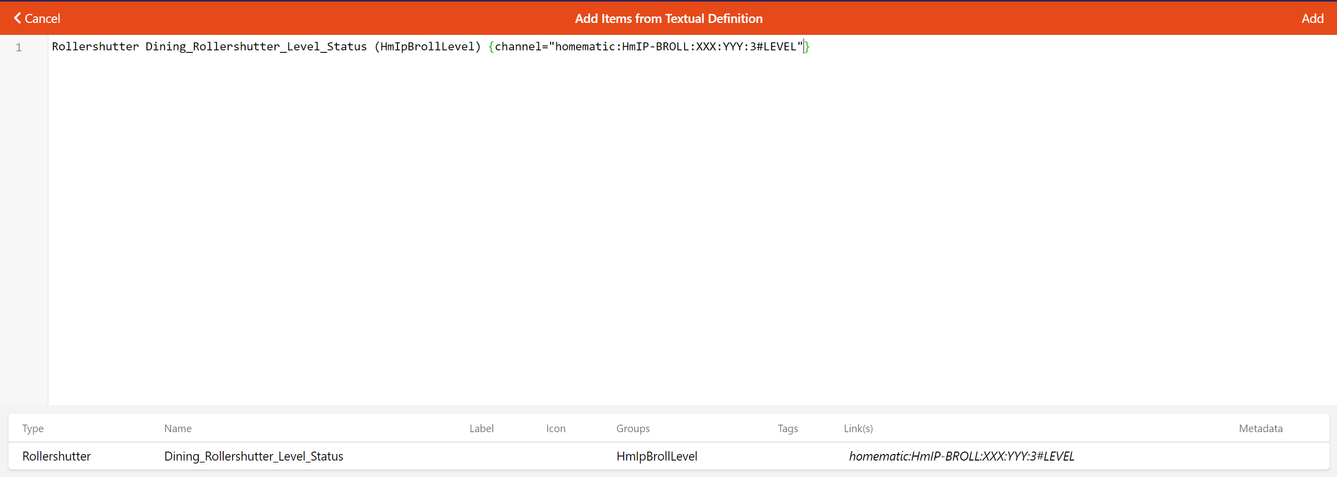 Rollershutter Dining_Rollershutter_Level_Actuator {channel=“homematic:HmIP-BROLL:XXX:YYY:4#LEVEL”}