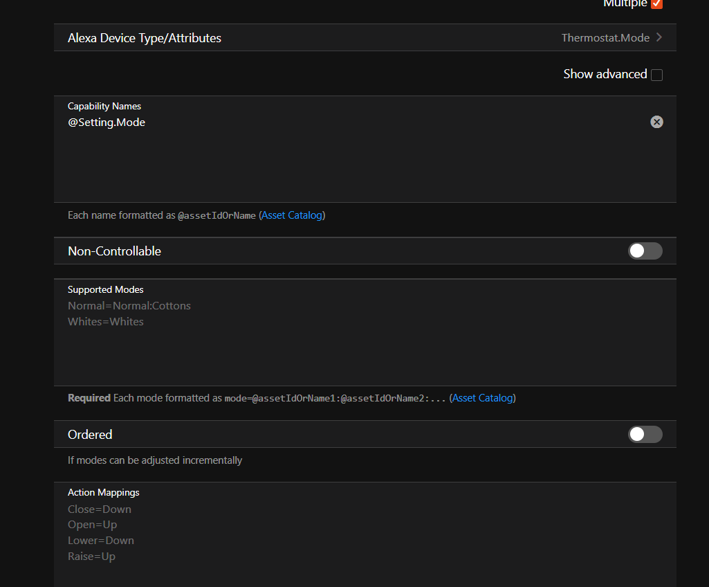 I thought about using Thermostat.Mode but I am unsure if that is correct and I am unsure what exactly to enter in Supported Modes and what exactly in Action Mappings.